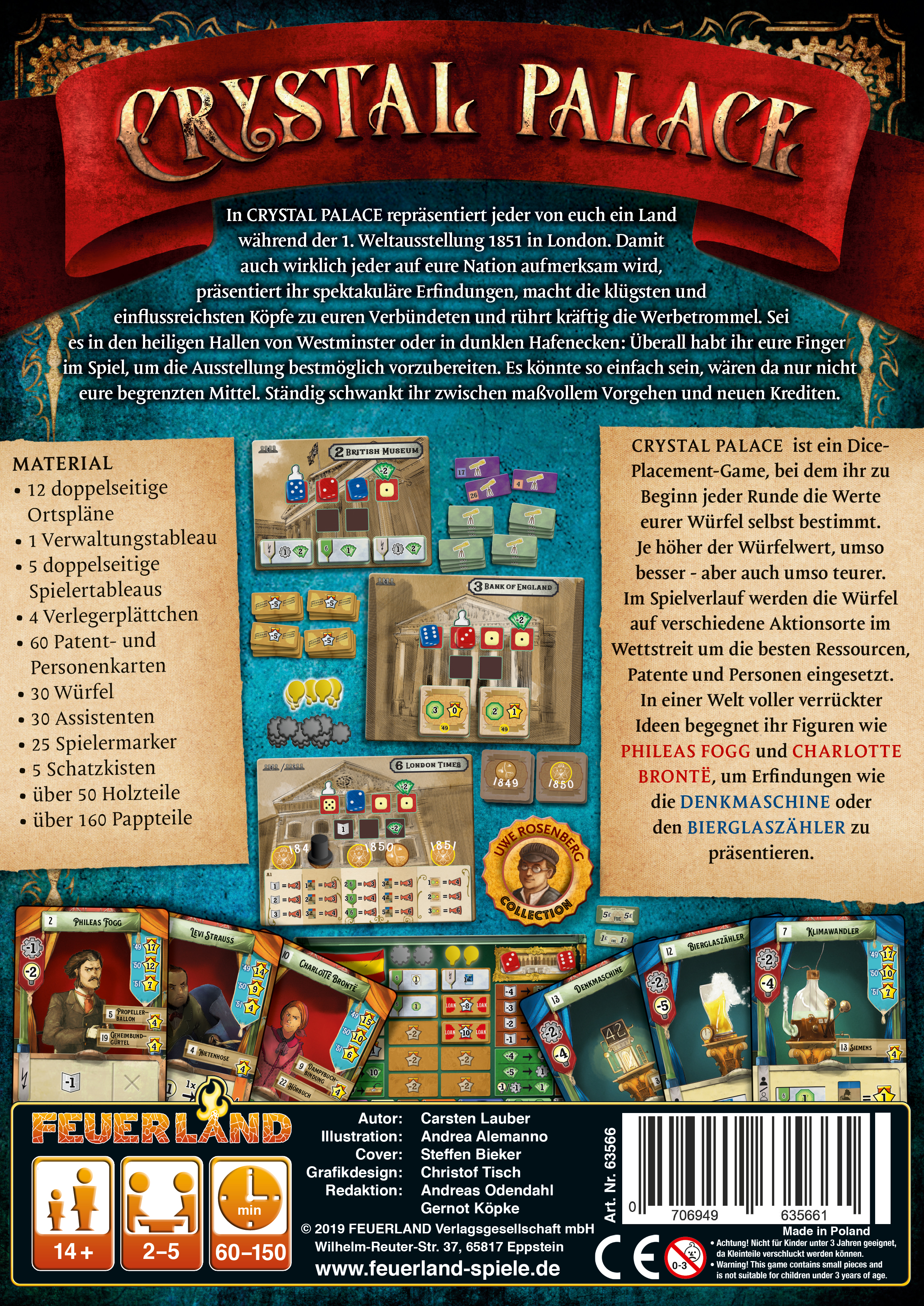 CRYSTAL PALACE ist ein Dice-Placement-Game, bei dem die Spieler zu Beginn jeder Runde die Werte ihrer Würfel selbst bestimmt. Je höher der Würfelwert, umso besser - aber auch umso teurer. Im Spielverlauf werden die Würfel auf verschiedene Aktionsorte im Wettstreit um die besten Ressourcen, Patente und Personen eingesetzt. In einer Welt voller verrückter Ideen begegnen sie Figuren wie PHILEAS FOGG und CHARLOTTE BRONTË, um Erfindungen wie die DENKMASCHINE oder den BIERGLASZÄHLER zu präsentieren.