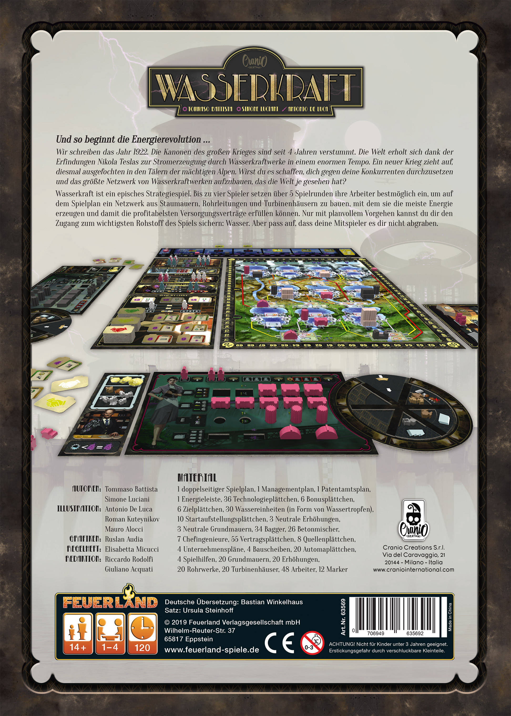 Wasserkraft ist ein episches Strategiespiel. Bis zu vier Spieler setzen über 5 Spielrunden ihre Arbeiter bestmöglich ein, um auf dem Spielplan ein Netzwerk aus Staumauern, Rohrleitungen und Turbinenhäusern zu bauen, mit dem sie die meiste Energie erzeugen und damit die profitabelsten Versorgungsverträge erfüllen können. Nur mit planvollem Vorgehen kannst du dir den Zugang zum wichtigsten Rohstoff des Spiels sichern: Wasser. Aber pass auf, dass deine Mitspieler es dir nicht abgraben.